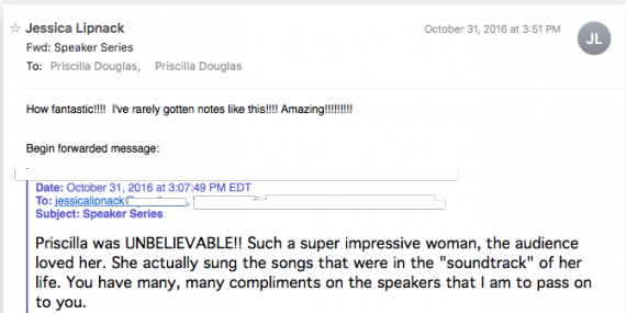 October 31, 2016. Newton Lifetime Learning Altman Distinguished Lecture series. Presentation entitled: The Songs of Our Lives. Description: Everyone has a soundtrack for their lives. Music and memory are inextricably linked: We hear a song and are transported back to a specific place and time steeped with emotions. Acclaimed leadership coach and former Secretary of Consumer Affairs and Business Regulations Priscilla Douglas, youngest of six raised on a farm in Bedford, MA, shares her songs and invites you to examine the ones that are touchstones of your life. http://www2.newtoncommunityed.org/wp-content/uploads/2016/08/LTL-F16-2-Final-8_9.pdf